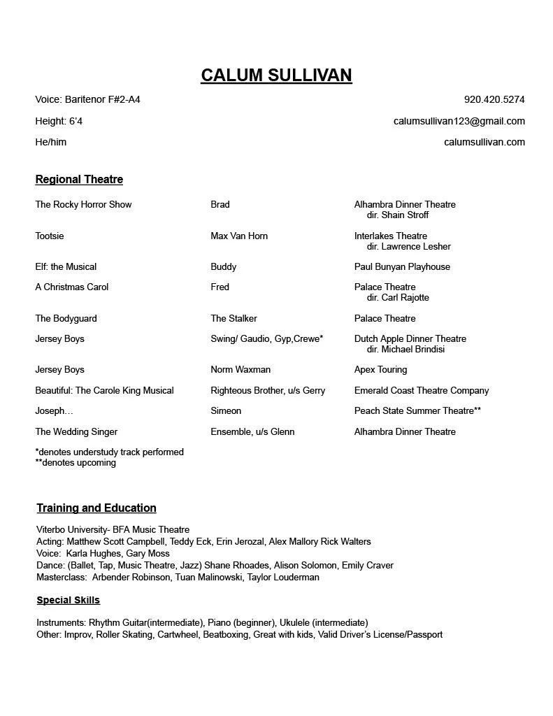 So nice of you to drop by!Hey there! I’m Calum Sullivan, I’m a Wisconsin born and bred (but now New York based) actor with a passion for singing, dancing and all around tomfoolery. I love making audiences laugh and using this skill to draw them deeper into stories that investigate what it really means to be human. When I’m not performing, you might find me enjoying the great outdoors, writing in a local coffee shop, or investigating one of the many comic book stores around New York City.