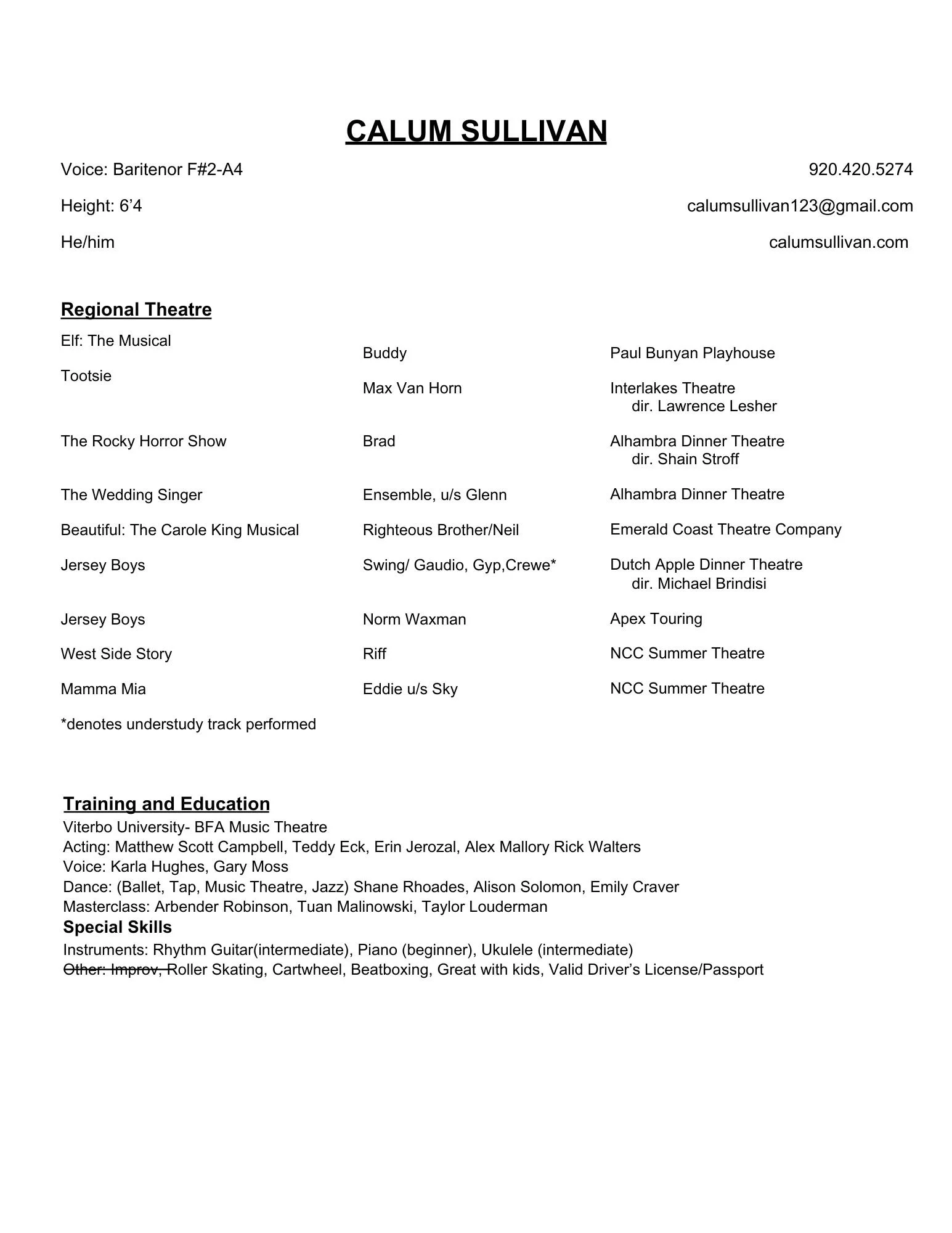 Hey there! I’m Calum Sullivan, I’m a Wisconsin born and bred (but now New York based) actor with a passion for singing, dancing and all around tomfoolery. I love making audiences laugh and using this skill to draw them deeper into stories that investigate what it really means to be human. When I’m not performing, I enjoy writing in coffee shops, playing video games (currently: Super Smash Bros Ultimate) and can be found investigating different parks around New York City.